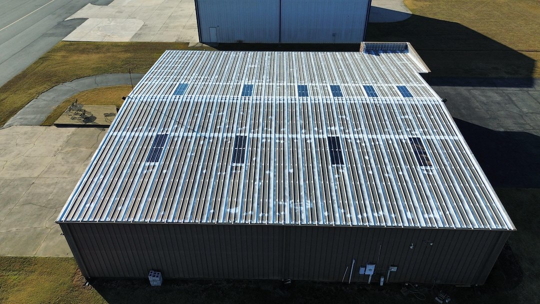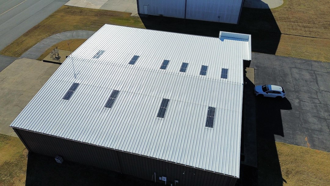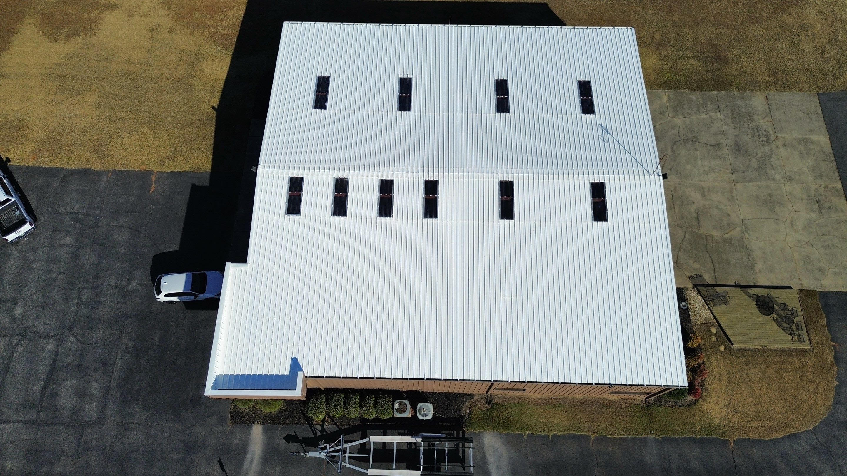 Diamond Roof Restorations recently completed a 10-year Uniflex Acrylic Over Metal Roof Restoration System for the AG Air Update building at the Houston–Perry County Airport in Perry, GA. The existing metal roof was fully cleaned, prepped, and restored with a bright white acrylic coating to improve energy efficiency and long-term durability. Our team also replaced 10 skylights, enhancing natural light while ensuring a secure, watertight installation.